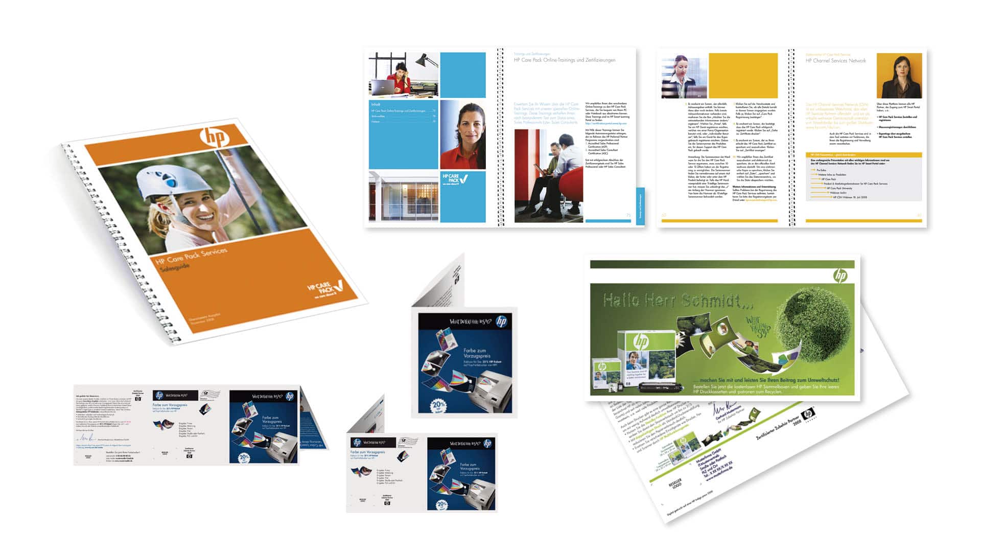 Brochures, personalized mailings according to the specifications of the former and new corporate design of HP.